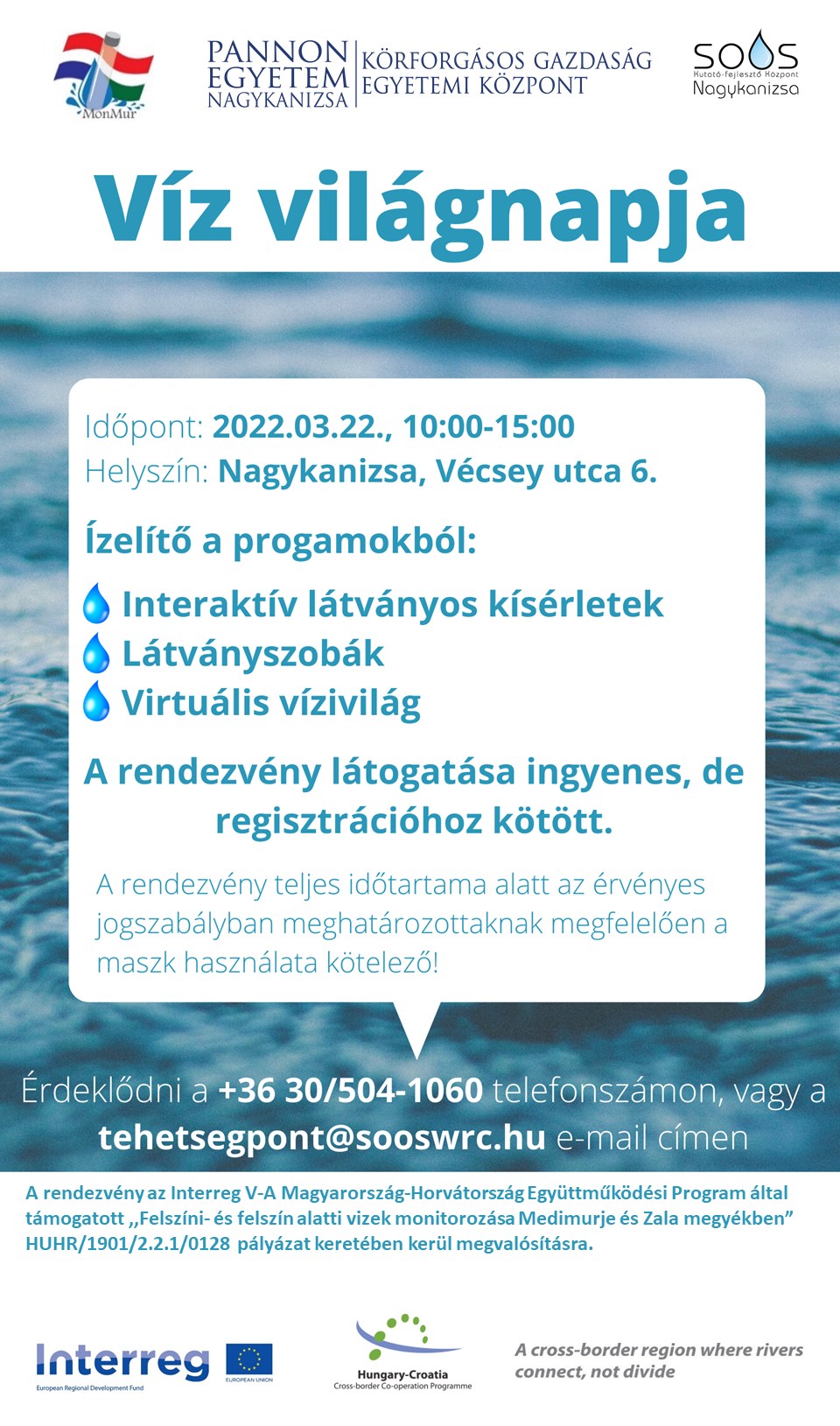 A Víz Világnapján, 2022. március 22-én színes programokkal várták a gyerekeket és az érdeklődőket laboratóriumában a Pannon Egyetem Soós Ernő Kutató-Fejlesztő Központ kollégái. Az idei feladatok során a vízmegtakarításról, a vízszennyezésről és más vízzel kapcsolatos érdekességekről is hallhattak a csoportok. Felhívták a figyelmet a vízszennyezésre, a víz jó állapotának a megőrzésére és a felszíni vizek állapotmegőrzésére is. A Batthyány Lajos Gimnázium tanulói a víz fizikai és kémiai tulajdonságairól tartottak előadást a rendezvényen, ezen kívül különböző látványos kísérletekkel, virtuálisvalóság-szobával és filmvetítéssel várták a programra látogatókat.